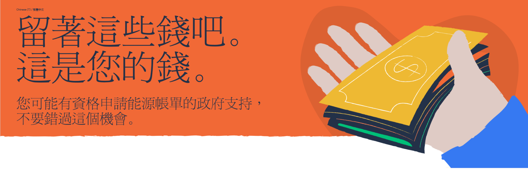 Home Keep the money. It's yours. Keep the money. It's yours. (Chinese Cantonese/繁體中文) Chinese Cantonese / 繁體中文 留着这些钱吧。 这是您的钱。 您可能有资格申请能源帐单的政府支持。请勿错过这个机会。